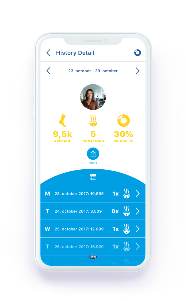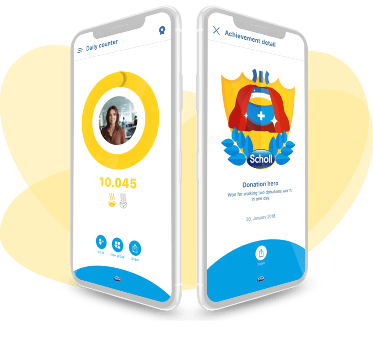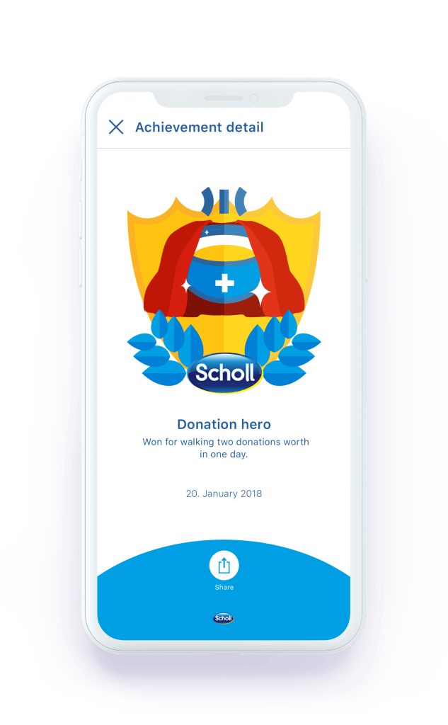 The app was intended to promote Scholl’s brand and a healthy lifestyle. Scholl has partnered with the the RedCross and created a donation campaign. The app aims to stimulates its users to be healthy with philanthropy, by donating a meal to a child in need for each 10000 steps a user has walked in a day.