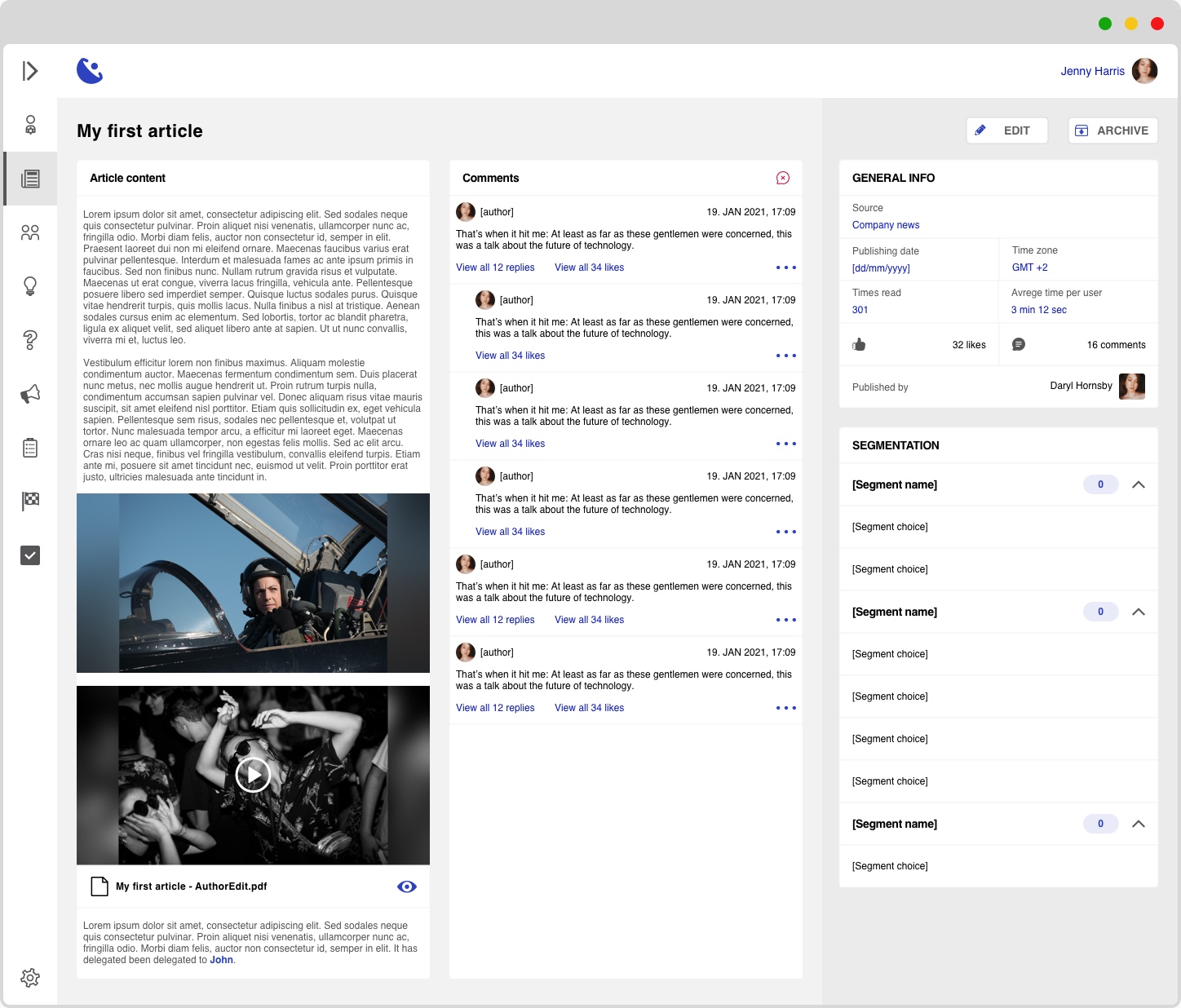 - published articles: will open a details page showing the article, comments from users and other meta data