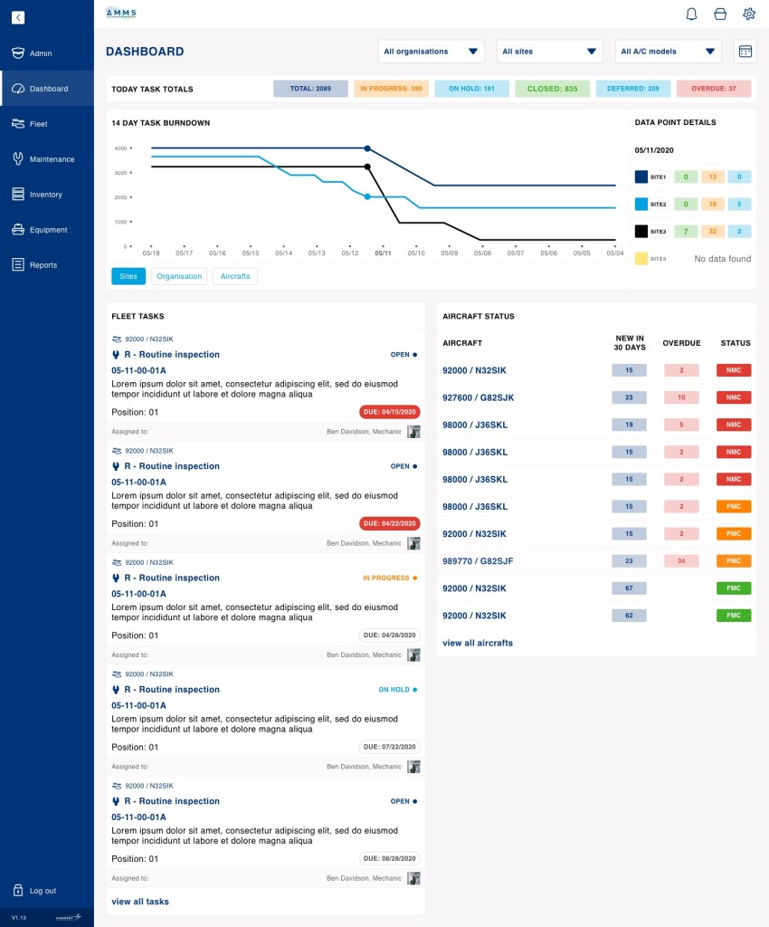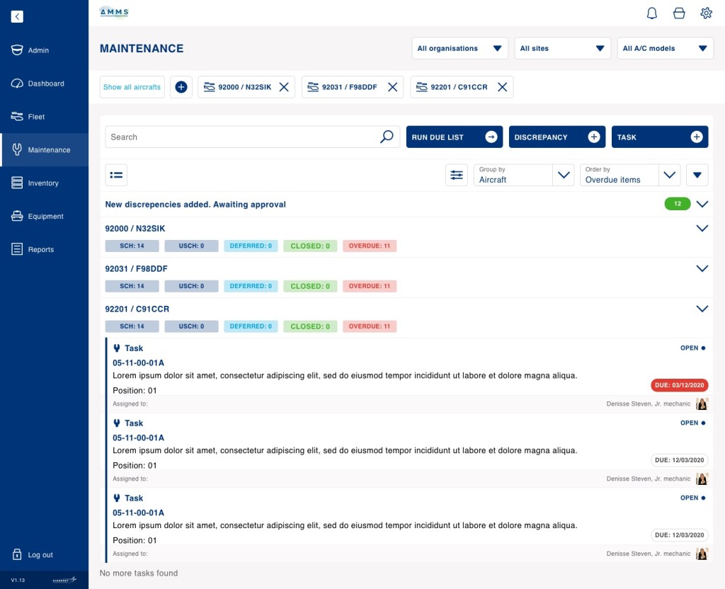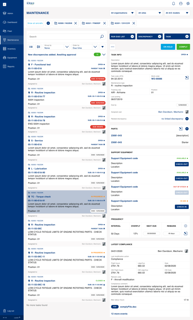 The aircraft maintenance platform has been designed to keep track of all aircrafts under one or multiple owners. The platform is supposed to display repair tasks that need to be performed on each aircraft, expected and unexpected. The tasks will be organised under work orders, present info on what needs to be performed, repair history, parts, and tools required.